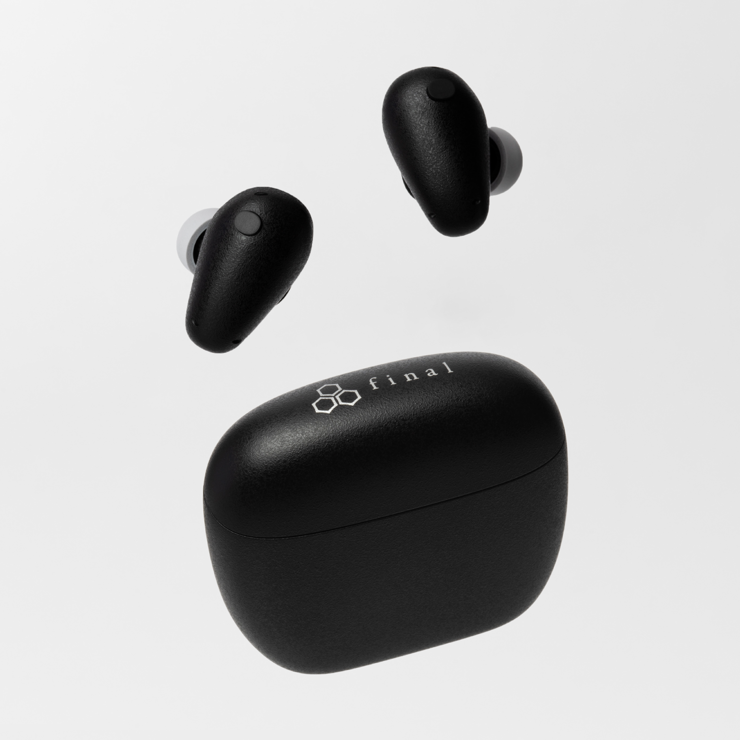 BLACKとWHITEの2色のカラーバリエーション。イヤホン本体と充電ケースは軽量の樹脂筐体でありながら、高級カメラの軍艦部を思わせる光沢感のあるシボ塗装仕上が施されています。通常このようなシボ塗装は金属表面に焼き付けて施されるのですが、樹脂表面にも施せる特殊加工を開発し実現しました。